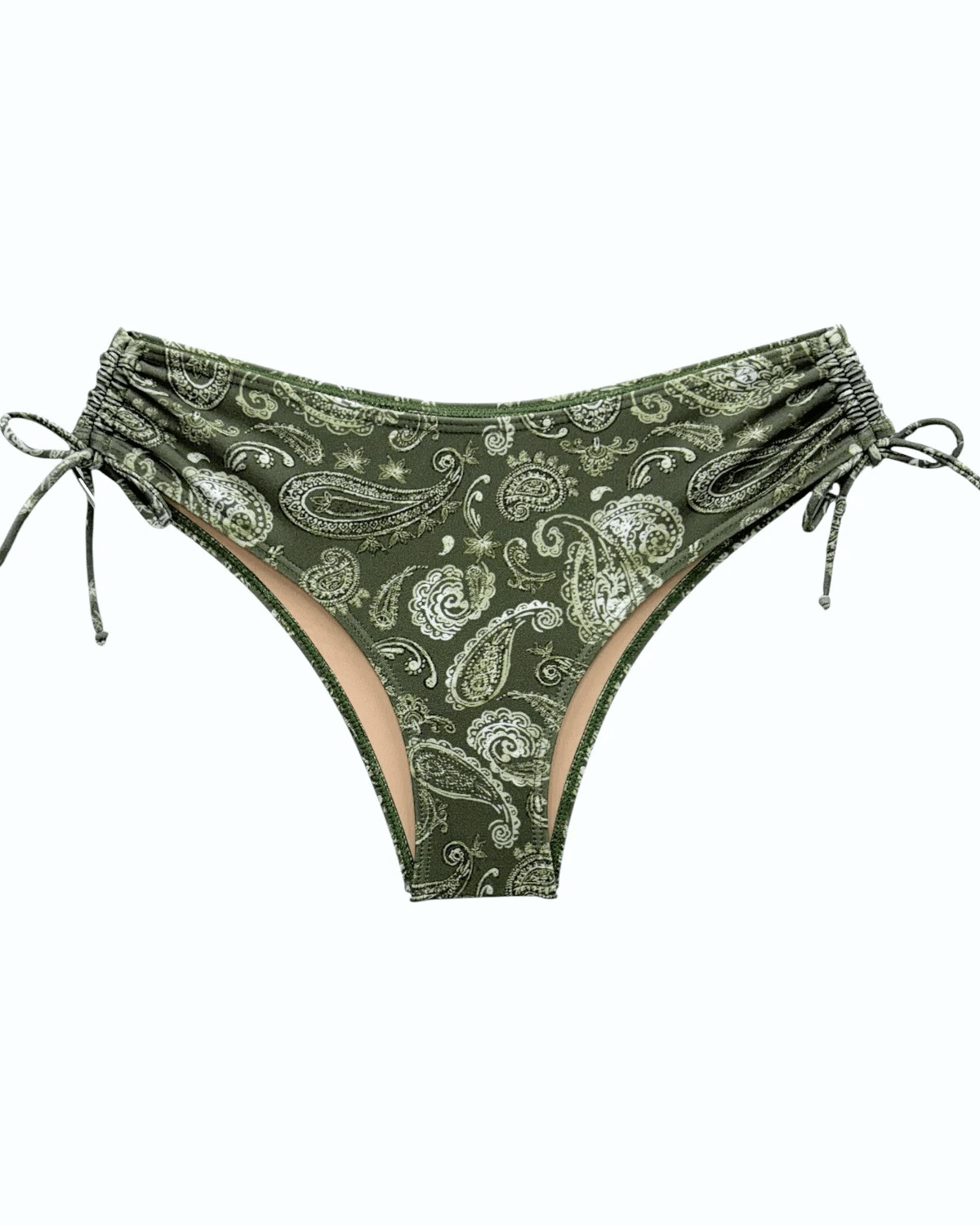 Tanga de biquíni lateral média com detalhe franzido e regulável.