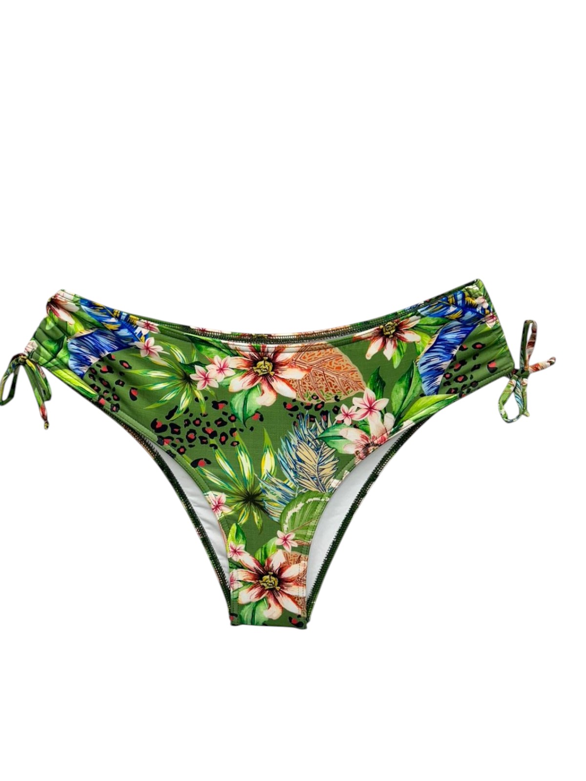 Tanga de biquíni lateral média com detalhe franzido e regulável com lacinho.