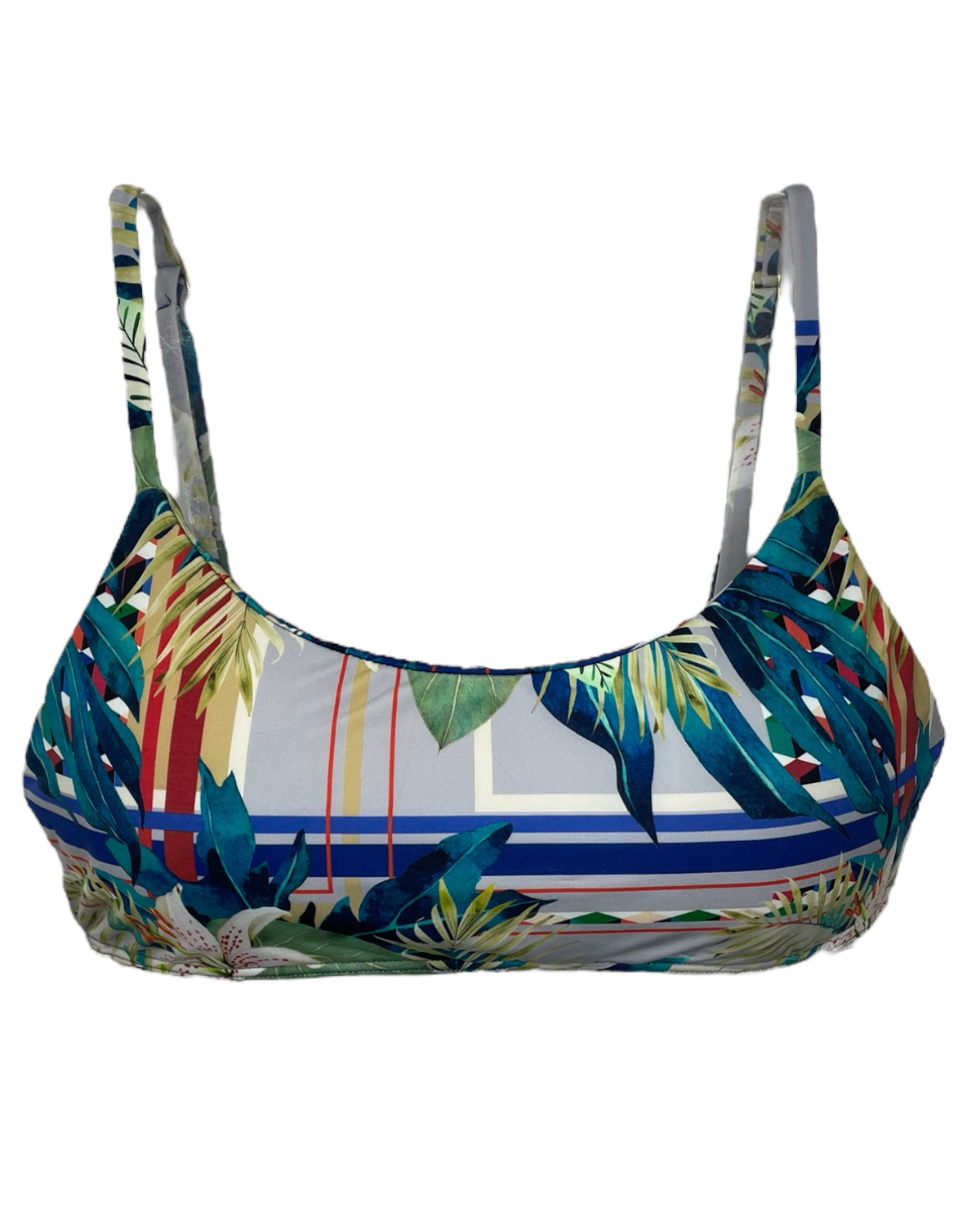 Top básico de biquíni estampado com decote redondo, costas reta, alças reguláveis e bojo removível. Modelo ideal para quem busca conforto e praticidade.