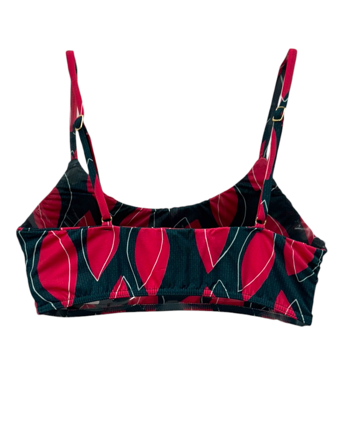 Top básico de biquíni estampado com decote redondo, costas reta, alças reguláveis e bojo removível.