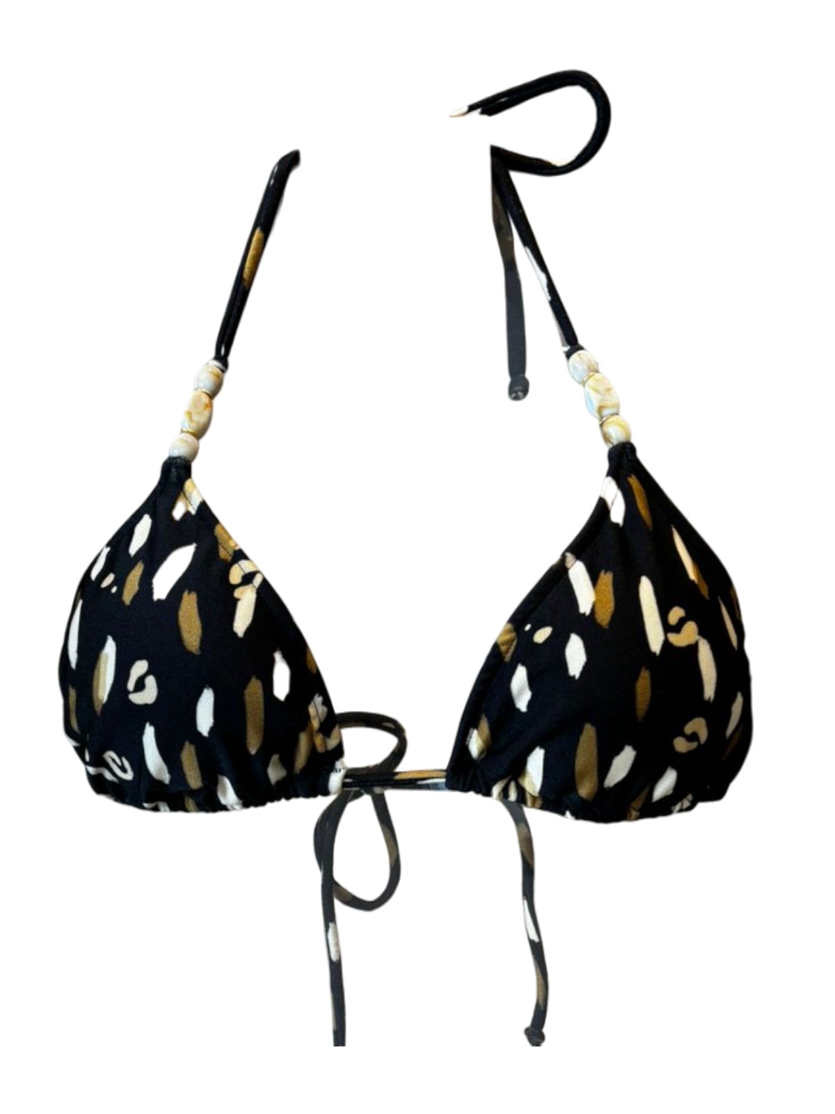 Top de biquíni modelo cortininha com bojo removível e amarração no pescoço e nas costas. Confeccionado em tecido estampado , Cor: Oliva Print. Detalhes nas alças feitos à mão com contas ( Beads) e metais.