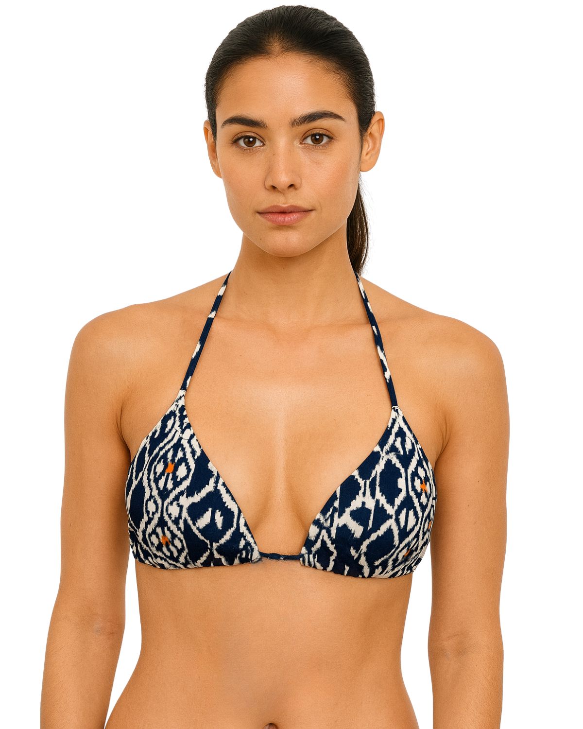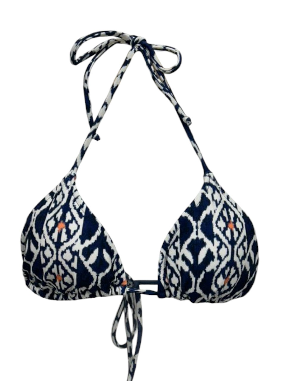 Top de biquíni modelo cortininha com bojo removível e amarração no pescoço e nas costas. Estampa: Ikat