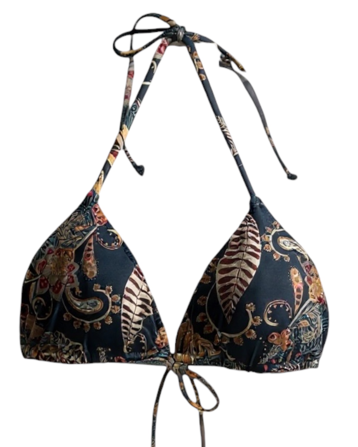 Top de biquíni modelo cortininha com bojo removível e amarração no pescoço e nas costas. Estampa: Teba Azul