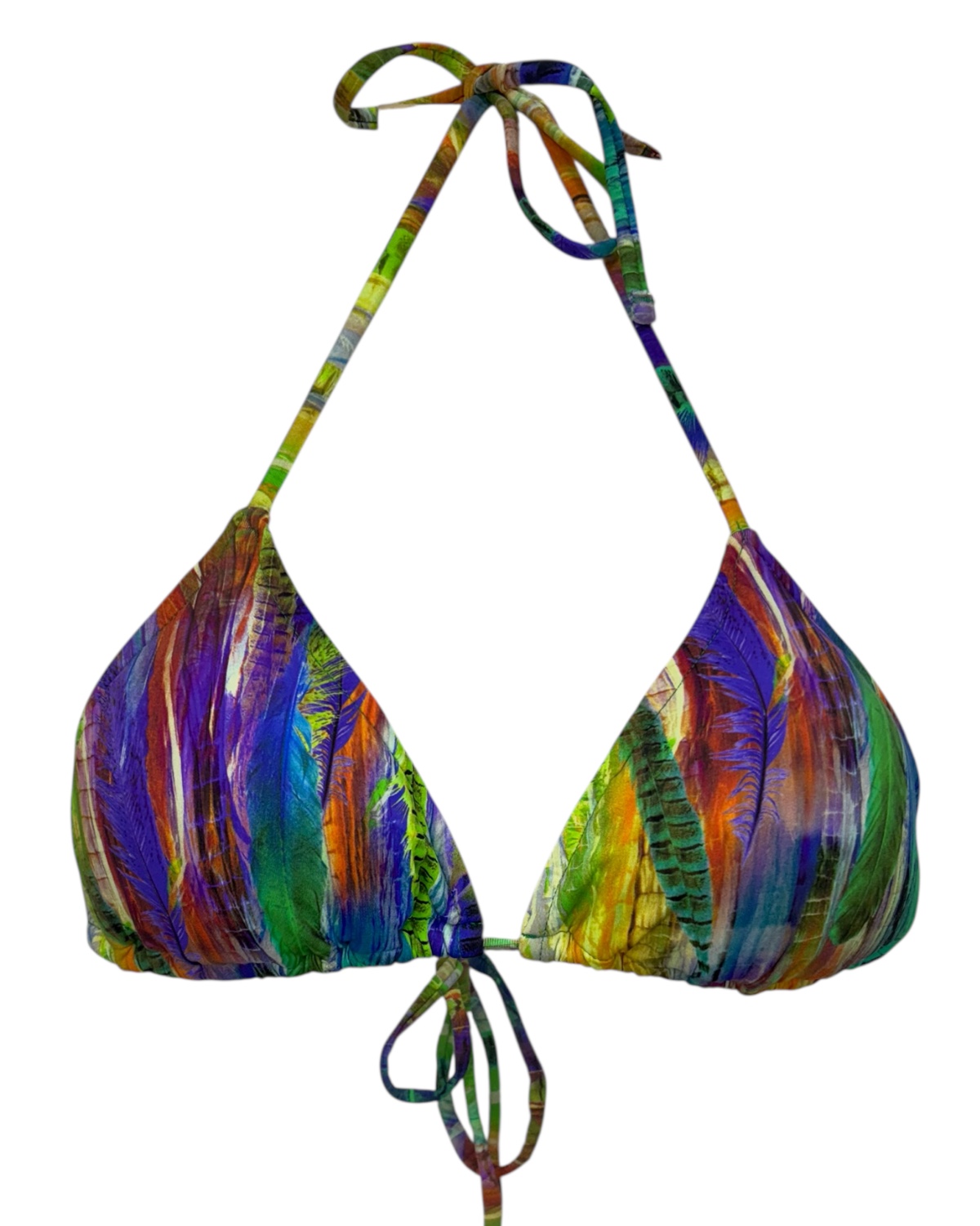 Top de biquíni modelo cortininha com bojo removível e amarração no pescoço e nas costas.