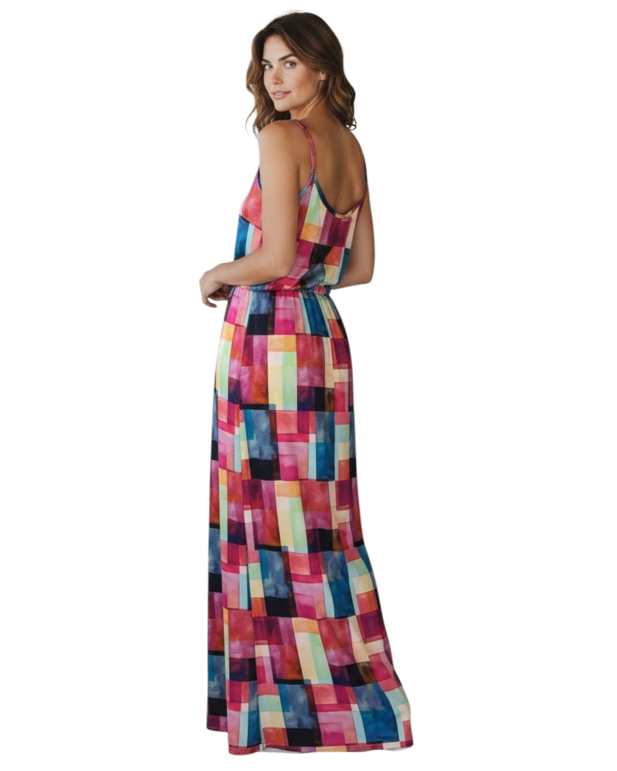 Vestido longo com alças finas e reguláveis com ajuste na cintura. Modelo reto e confortável .